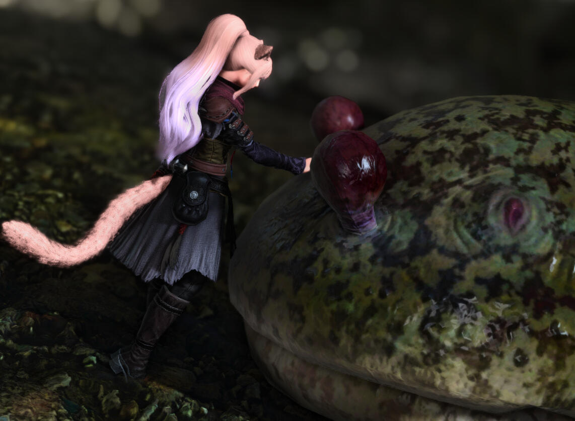 The sun had barely crested the horizon, casting a soft, golden light over the desert as Aria and Bodhi trekked further into the wilds. The cool, early-morning air carried the familiar scent of dust and herbs, mixing with the faint undertones of minerals and salt. It was one of those perfect mornings when the world felt at peace with itself, and nature seemed to be whispering its secrets to those who were patient enough to listen.Aria’s boots crunched quietly through the dunes of sand, her senses sharp as she moved. Beside her, Bodhi trotted with his usual energy, his silver fur blending almost seamlessly with the soft shadows of the forest. His golden eyes glimmered with a mischievous light, but there was also a quiet understanding in them as he followed Aria's lead.They were on a mission today, one that Aria had been anticipating for weeks. Word had reached her of a creature— a Sundrake— roaming the deserts of Eastern Thanalan. A beast born from the power of the earth itself, with rock-hard scales that shimmered in shades of red, browns, and black. Its eyes glowed with an unnatural light, and the ground trembled when it moved. This creature, though majestic, had become a danger to those who lived nearby. But Aria knew better than anyone that it was not evil or malicious— it was simply a force of nature, displaced and confused by the encroachment of civilization.Today, Aria was determined to help the Sundrake find peace... not through battle or force, but through understanding.The pair ventured deeper into the heart of the forest, where the trees grew thick and the light barely touched the ground. The quiet of the place was both eerie and serene, the only sounds being the soft rustling of sand blowing through the the wind and the occasional call of a distant bird. They moved silently, Aria’s senses attuned to every whisper of the desert. It was then that she noticed it. Something out of place.The earth beneath her feet trembled ever so slightly, like a heartbeat, and she paused. Bodhi froze beside her, his sharp ears flicking toward the source of the disturbance. He stared ahead, eyes narrowed with focus.Aria closed her eyes for a moment, listening carefully. She could feel the presence of the Sundrake now, the raw, untamed energy that hummed through the ground, vibrating against her very bones. It was close. Too close.The creature, sensing her presence, was already moving toward them.Aria took a deep breath, steadying herself, and whispered to Bodhi, "Stay close." The fox’s tail flicked in acknowledgment as he moved silently by her side.Ahead, Aria finally saw it— a towering figure emerging from behind a thick cloud of dust. The Sundrake stood in the clearing, its massive form gleaming in the light of the rising sun. Its body was covered in rough, jagged scales, a deep maroon with veins of soot black running through them. Its eyes, glowing with a strange, otherworldly light, locked onto Aria. The creature’s heavy footsteps made the ground beneath them tremble with each movement, and its growl echoed through the air, a deep, rumbling sound that seemed to shake the very air.Bodhi let out a soft growl, but Aria placed a calming hand on his head. "Not yet," she whispered. The fox relaxed slightly but remained alert, ready for whatever came next.The Sundrake's glowing eyes flicked from Aria to Bodhi, then back again. It was cautious, unsure. Aria could feel the creature’s fear. It wasn’t hostile, not yet, but it was uncertain, defensive. It had been displaced from its natural habitat, pushed out by the growing presence of man in the desert. It was angry, yes— but it was also scared."Easy," Aria murmured softly, taking a slow, deliberate step forward. Her heart beat steadily in her chest, and she kept her body language open, non-threatening. She knew better than to rush in or make any sudden movements. The Sundrake was a creature of the earth— its instincts were tied to the land, and it would respond to pressure or hostility with violence. Aria needed to show it that she wasn’t a threat.The creature growled again, but this time it was less forceful, more uncertain. Its massive tail flicked in the air, sending a small tremor through the earth. Aria remained still, her gaze soft but unwavering, locking onto the beast’s eyes."Bodhi, stay," she whispered again, her voice firm but gentle.The fox, understanding the seriousness of the moment, stepped back and sat down beside her, his tail wrapped neatly around his paws. He looked up at Aria, waiting for her next move.Aria took another step forward, this time extending her hand slowly. The Sundrake's eyes followed the movement, but it didn’t react. It was wary, but it hadn’t attacked yet. She knew that was a good sign.She kept her voice low and steady, speaking softly to the creature. "You’re not alone. I know you’re scared, but I’m not here to harm you. I’m here to help. You’ve been pushed, but you don’t have to fight anymore."The Sundraka tilted it's head at her words, its massive chest rising and falling with each breath. It was still watching her closely, but there was something in its posture now... something that told Aria it was listening. Its head lowered slightly, and the ground beneath it settled, no longer shaking with tension.Aria took another step, her hand still outstretched, and this time, the Sundrake did not move away. Its eyes flickered for a moment, and then, slowly, it took a tentative step forward, its massive feet sinking slightly into the sand.For a long moment, the two stood there. Aria, with her hand still extended, and the Sundrake, its large form lowering slightly. Aria could feel its uncertainty, its pain. The creature had been isolated, driven to the brink by fear and the threat of man, and it had reacted by attacking. But now, in this moment, it was seeking something different. Connection. Understanding.Aria smiled softly, and with a final deep breath, she reached out to gently